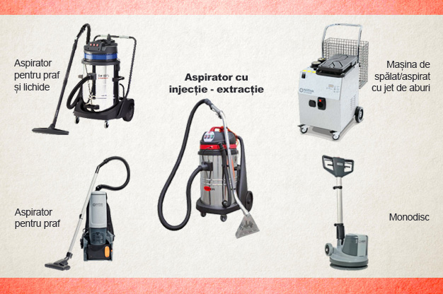 - Un aspirator cu injecție – extracție cu electroperie și fără electroperie dotate cu kit-uri pentru spălat canapele, fotolii, draperii etc.